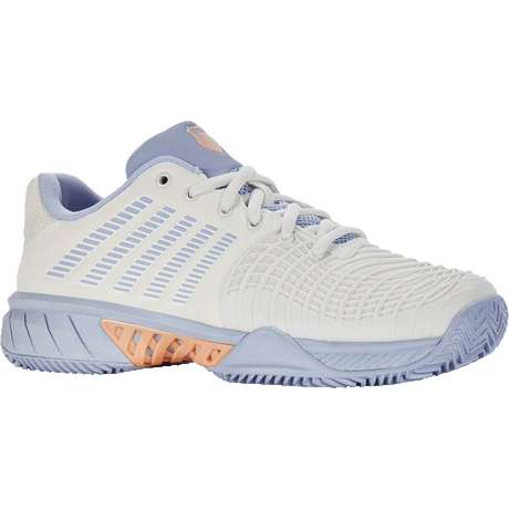 The K-Swiss Express Light 3 HB is a lightweight tennis shoe designed for on-court performance and a great level of comfort. As the updated model of its successful predecessor, the upper features DuraWrap Flex, a newly designed molded RPU cage that provides flexible support and drag protection. On the inside, a well-padded ankle collar provides comfort and stability while a die-cut foam sock liner adds responsive cushioning underfoot. The Express Light 3 has HB outsole featuring deeply grooved herringbone patterns for exceptional traction on clay court surfaces.
